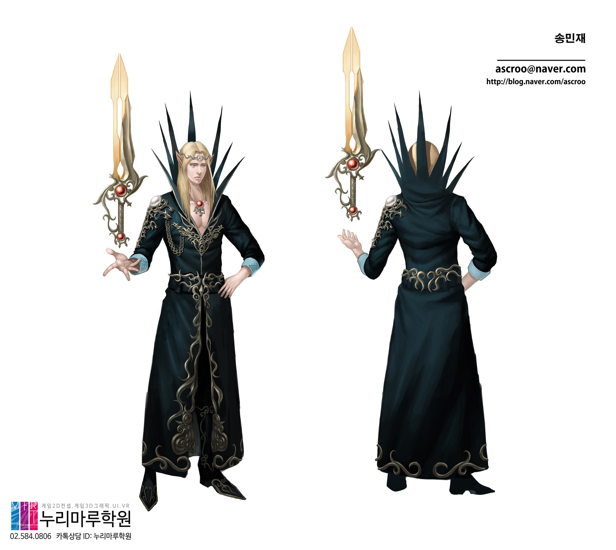 엘프 남성의 이미지를 잘 살린 송민재 학생의 '이기어검' 작업물입니다. :3 전면과 후면 이미지가 자연스럽게 잘 나왔고, 무엇보다 복식과 장식이 멋지게 잘 나온 것 같습니다. :)